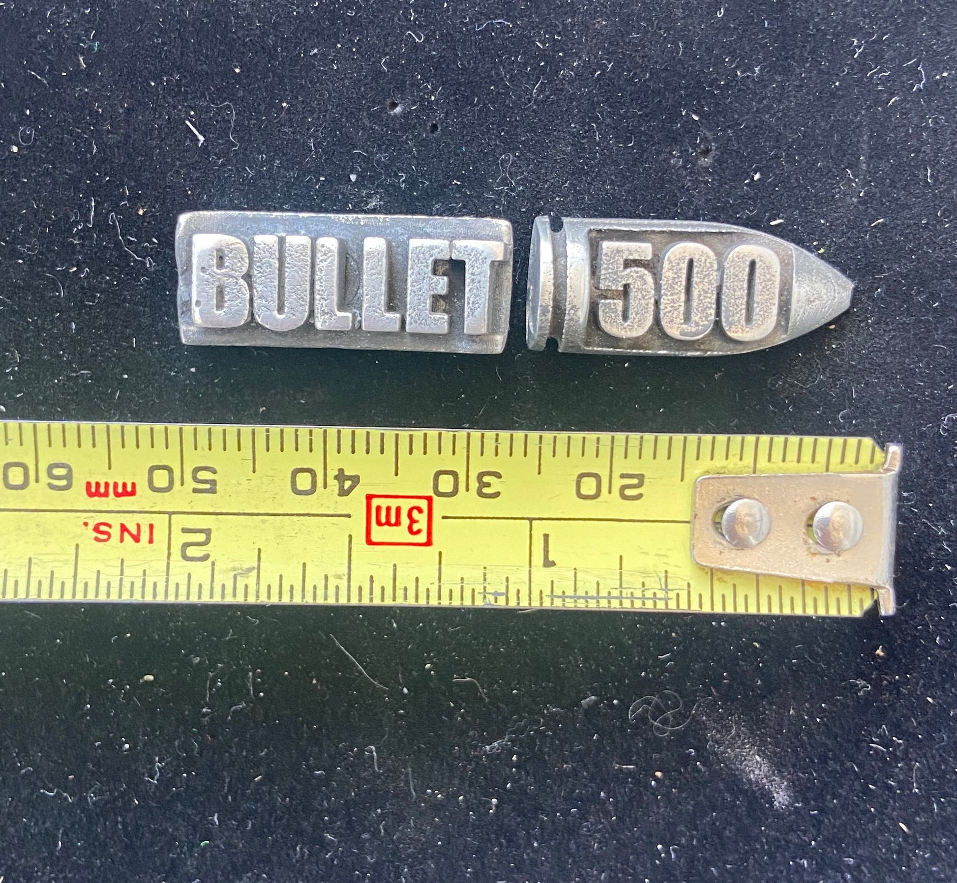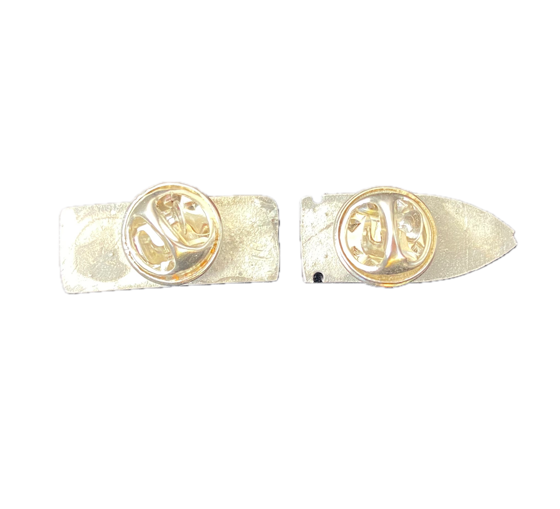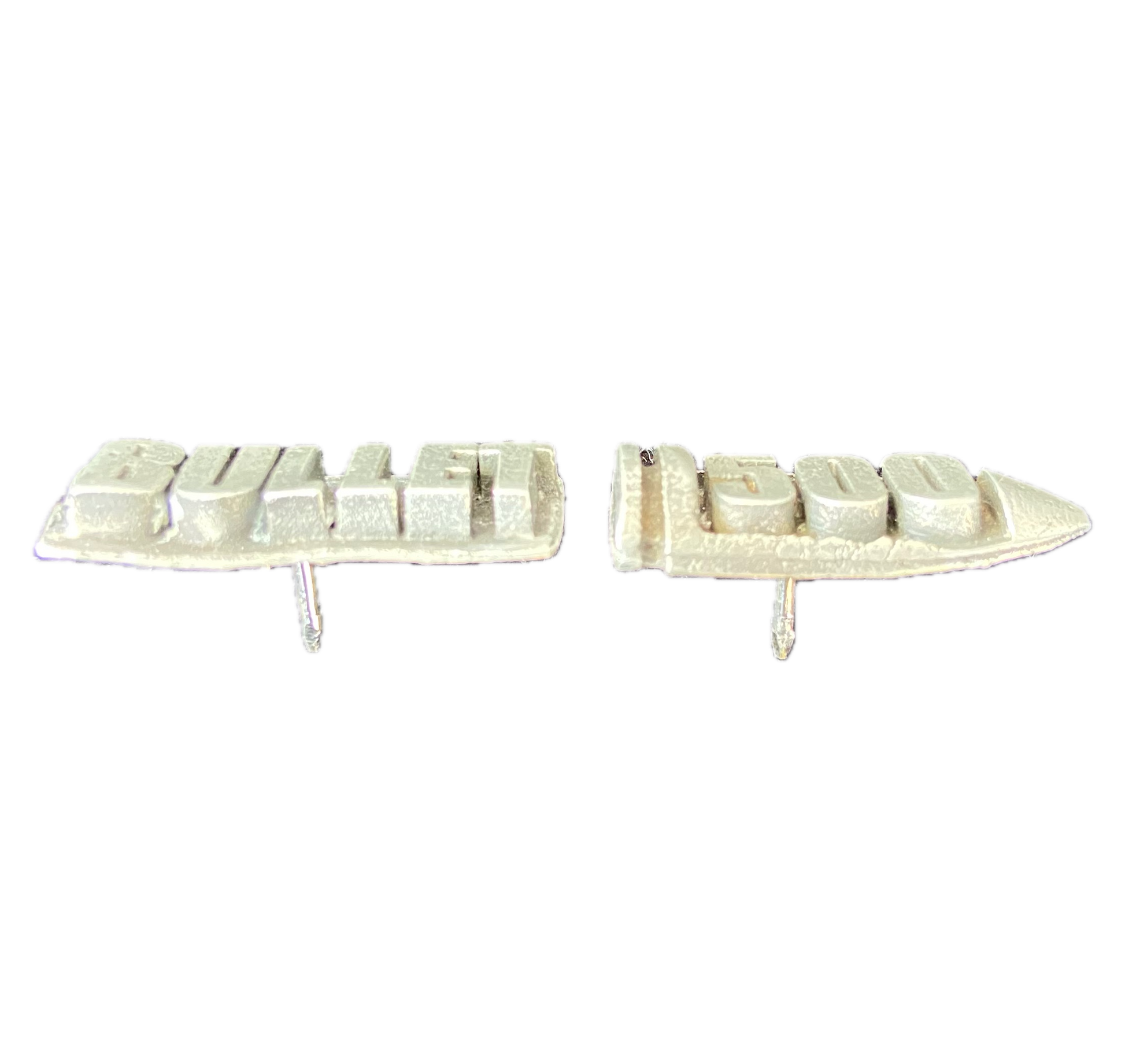 The "Bullet" text pin measures approximately 1" across, the "500" bullet shaped pin is approximately 15/16" across. Both pieces are 3/8" tall and have a traditional butterfly clasp.